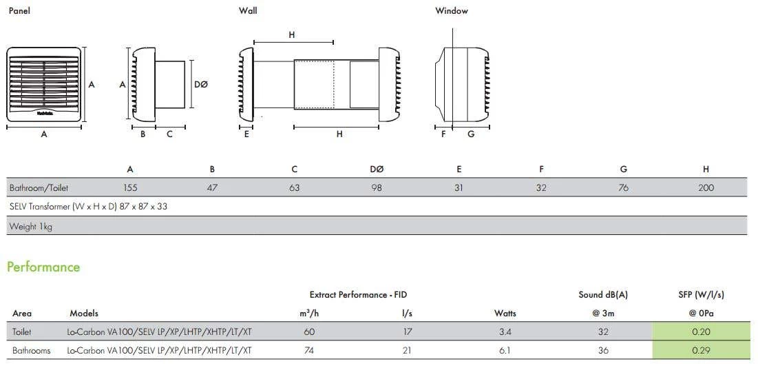 Ultra long life DC motor. Pullcord On/Off override switch with indication light. 2 speed options. The improved Vent-Axia Lo-Carbon VA100 range features Lo-Carbon long life DC motors that are more efficient than conventional motors whilst delivering up to 87% energy savings. They are fitted with a motorised shutter mechanism that uses no extra power in operation or off. Fitted with integral protection against low energy lighting circuits, the VA100 is a 100mm axial fan suitable for use in the bathroom or toilet. VA100 is a quick and simple to fit product with easy-wire on one line terminals. Suitable for installation in window, walls or panels/ceilings at any angle using kits available. The 100mm telescopic wall kit fit walls 225 to 360mm thick. The range meets the requirements of the current Building Regulations for the ventilation of toilets 6l/s and bathrooms 15l/s with a 15 minute overrun timer for internal rooms on the LT, XT and HTP models.